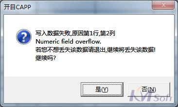 在KMCAPP網(wǎng)格中導(dǎo)入EXCEL表格數(shù)據(jù)時,報錯“寫入數(shù)據(jù)失敗,原因第1行,第2列Numeric fieldoverflow.若您不想丟失該數(shù)據(jù)請退出,繼續(xù)將丟失該數(shù)據(jù)。繼續(xù)嗎?”如圖