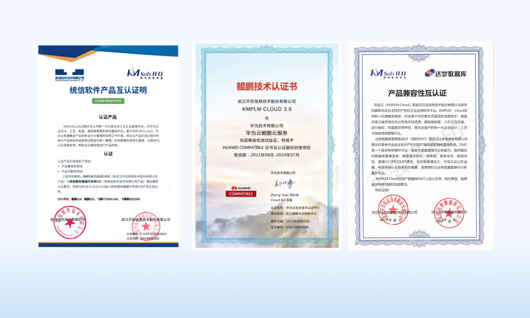 “開目軟件自主研發的KMPLM CLOUD 獲得華為技術有限公司華為云鯤鵬云服務、華為云Stack 8.0(鯤鵬)雙重兼容性技術認證,標志著KMPLM CLOUD能夠穩定運行在國產化基礎設施之上,可以更好地滿足大型企業對于系統安全可靠、技術自主可控的需求。”