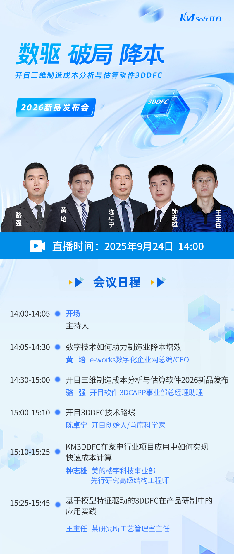 為深度解讀3DDFC 2026的技術突破與行業實踐,分享智能制造時代的產品成本優化策略,開目軟件定于2025年9月24日(周三)14:00舉辦“數驅 破局 降本·開目三維制造成本分析與估算軟件3DDFC 2026新品發布會”,特邀您云端參會!