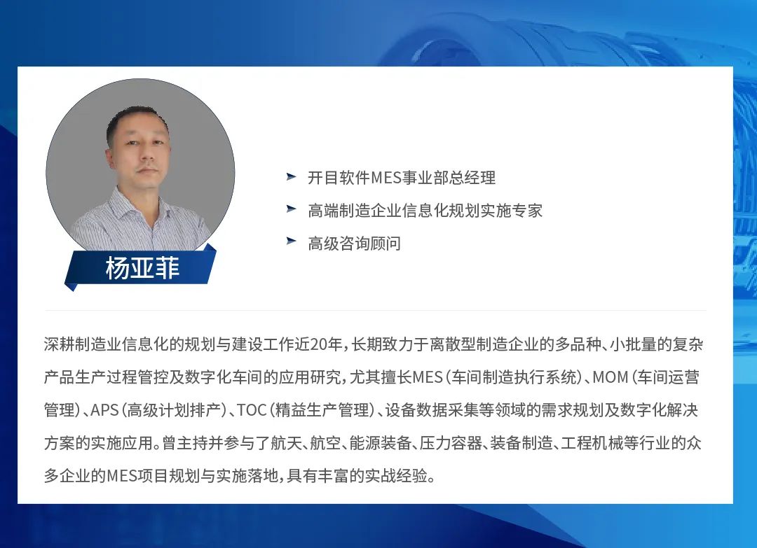 本期研討會特邀開目公司MES事業部總經理楊亞菲、四機賽瓦生產總監黃志軍、廣日電梯信息中心副主任付東軍做客開目線上直播間,專家將全程在線答疑,與來賓深入探討開目制造執行系統MES的優勢特點與實際落地應用。
