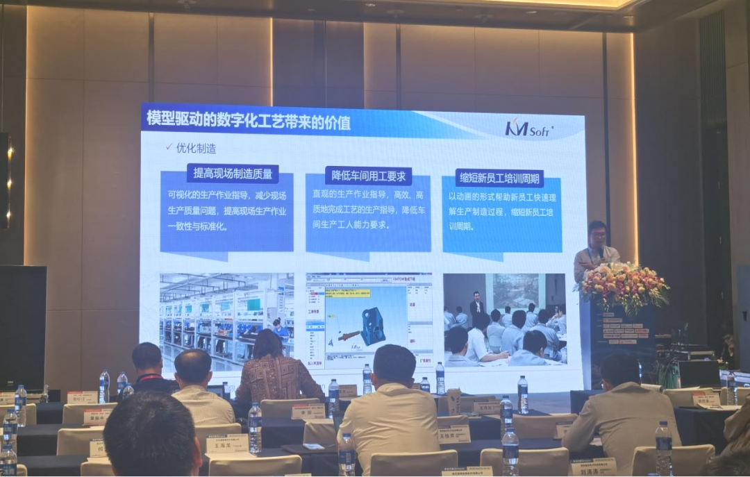 開目公司3D事業部總經理助理駱強應邀在大會發表《模型驅動的數字化制造賦能企業轉型》主旨演講,駱總從當前制造企業數字化轉型普遍面臨的問題為切入點,講述了開目面向中國制造企業潛心研制的“面向模型驅動的數字化工藝制造解決方案”,在全三維模型的環境下,構建一體化的智能創新工藝管理平臺,可幫助企業提升工藝設計能力,實現三維可視化工藝下車間,優化企業生產制造。