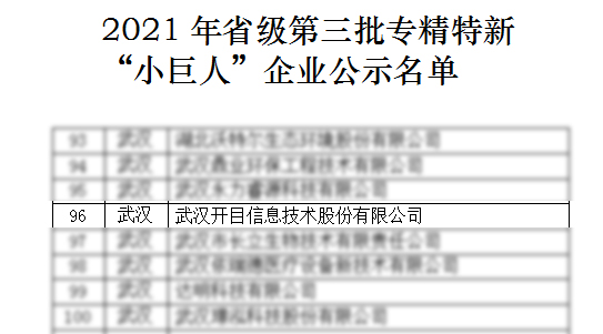 近日,湖北省經濟和信息化廳公布了2021年度省級專精特新“小巨人”企業名單,武漢開目信息技術股份有限公司成功入選。