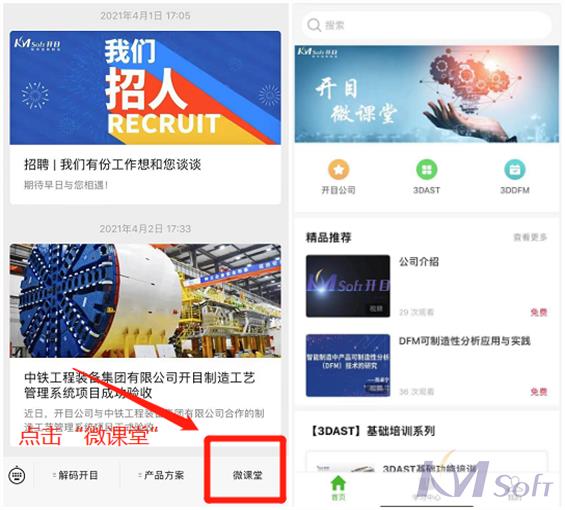 公眾只需在關(guān)注“開目軟件”微信公眾號后,點擊頁面下方的“微課堂”按鈕,便可登錄平臺在線學(xué)習(xí)。具體操作步驟如下: