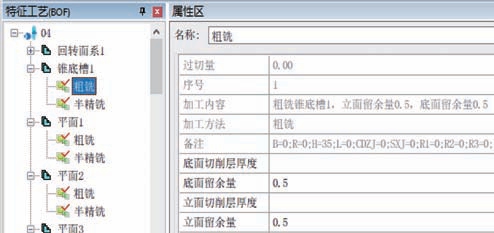 針對機匣類型零件,定義一套加工知識庫,基于識別的特征的幾何信息與制造信息進行加工方法推理,推理出特征的加工步驟以及余量。如機匣中的錐底槽特征經過知識庫的推理得出的加工步驟為“粗銑—半精銑”,且粗銑的底面與立面的余量為0.5 mm,如圖4所示。