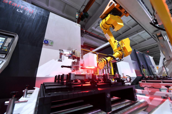 哈電集團集成工業機器人正在機器視覺引導下進行上下料作業。
