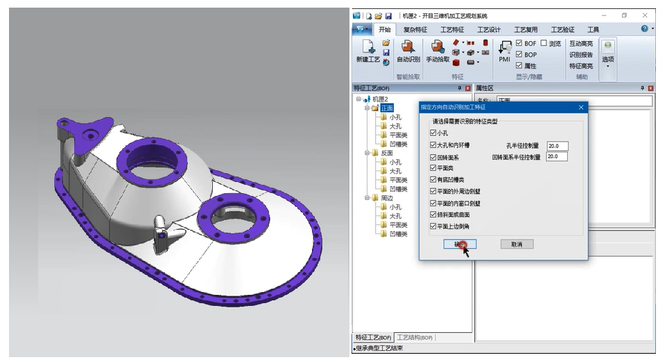 3DMPS 11.0開放了更多加工特征類型,支持對特征的輪廓進(jìn)行二次編輯,以適應(yīng)不同的加工場景;支持按照方向一鍵自動識別大部分特征,大大減少了零件特征分析所需時間,并增強(qiáng)了對零件進(jìn)行工藝分析的準(zhǔn)確率。