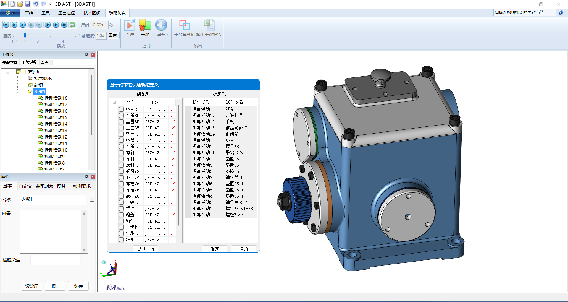 3DAST智能拆卸功能,可以基于零件空間位置與接觸關(guān)系,自動(dòng)推薦該工序零部件的拆卸順序與運(yùn)動(dòng)軌跡。這極大地簡(jiǎn)化了三維裝配工藝的制作流程,讓工程師從繁重的手動(dòng)操作中解脫出來,減少了因人為失誤導(dǎo)致的設(shè)計(jì)返工,加快了產(chǎn)品從設(shè)計(jì)到生產(chǎn)的進(jìn)程,對(duì)于整體三維裝配工藝制作操作效率提升60%以上。