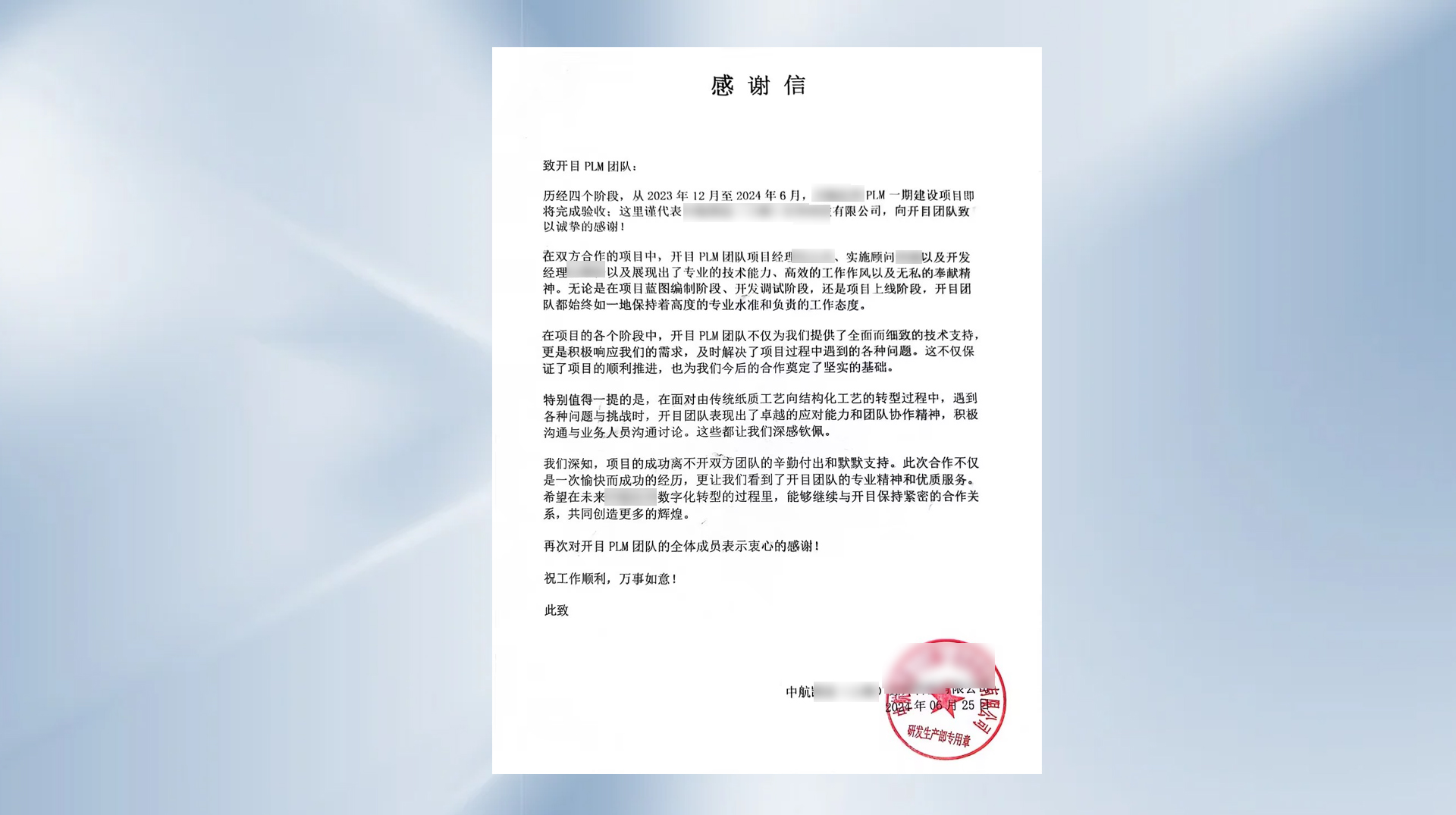 項(xiàng)目驗(yàn)收后,中航工業(yè)集團(tuán)某公司給PLM項(xiàng)目組發(fā)來(lái)感謝信,其中提到:“在面對(duì)由傳統(tǒng)紙質(zhì)工藝向結(jié)構(gòu)化工藝的轉(zhuǎn)型過(guò)程中,遇到各種問(wèn)題與挑戰(zhàn)時(shí),開(kāi)目團(tuán)隊(duì)表現(xiàn)出了卓越的應(yīng)對(duì)能力和團(tuán)隊(duì)協(xié)作精神.......希望在未來(lái)數(shù)字化轉(zhuǎn)型的過(guò)程里,能夠繼續(xù)與開(kāi)目保持緊密的合作關(guān)系,共同創(chuàng)造更多的輝煌。